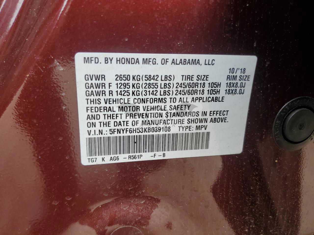 • VIN: 5FNYF6H53KB039108