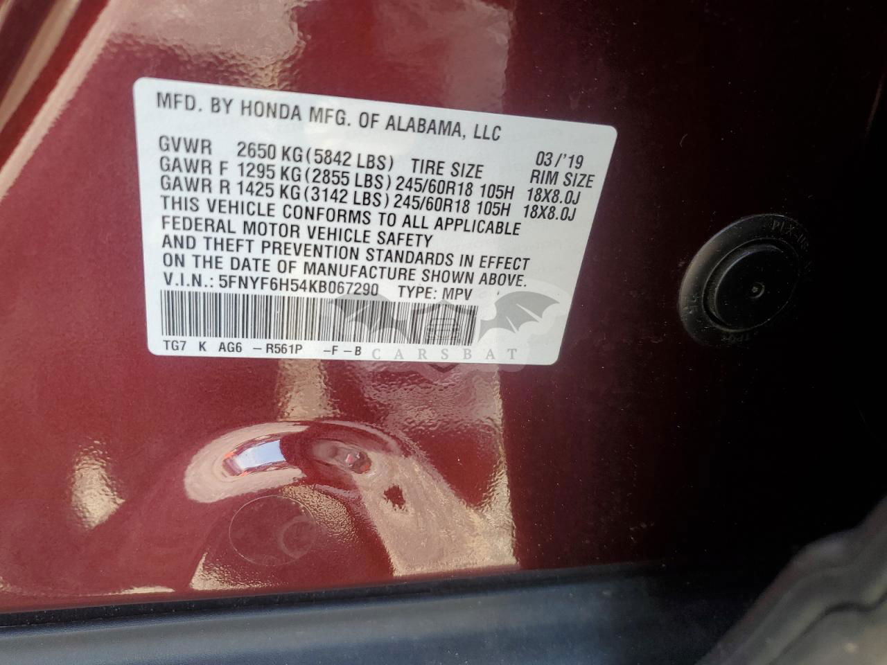 • VIN: 5FNYF6H54KB067290