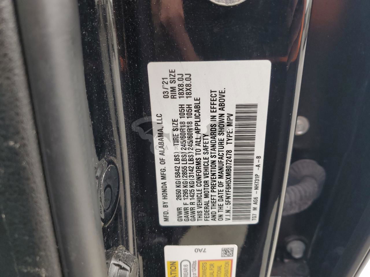 • VIN: 5FNYF6H5XMB072478