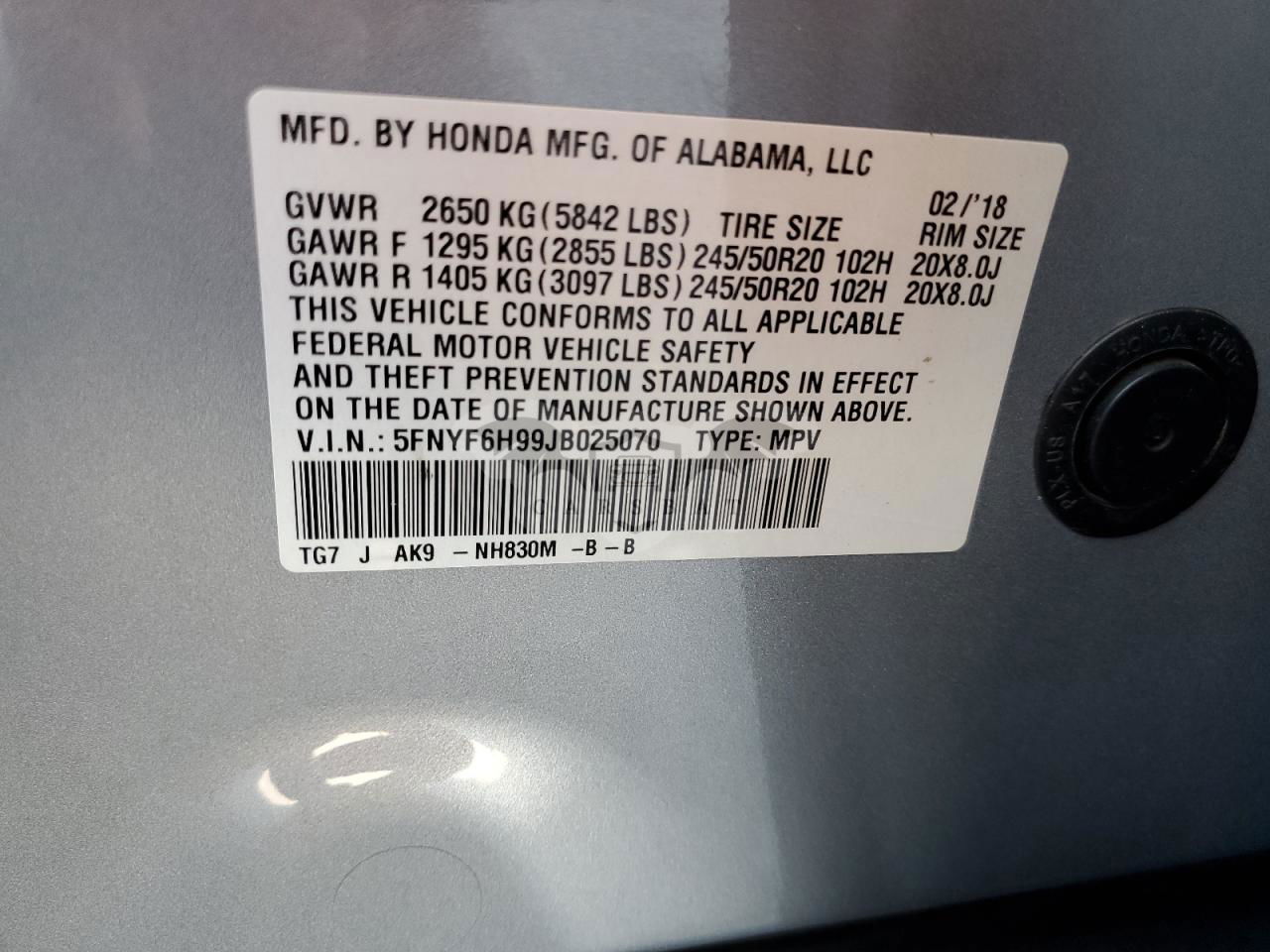 • VIN: 5FNYF6H99JB025070