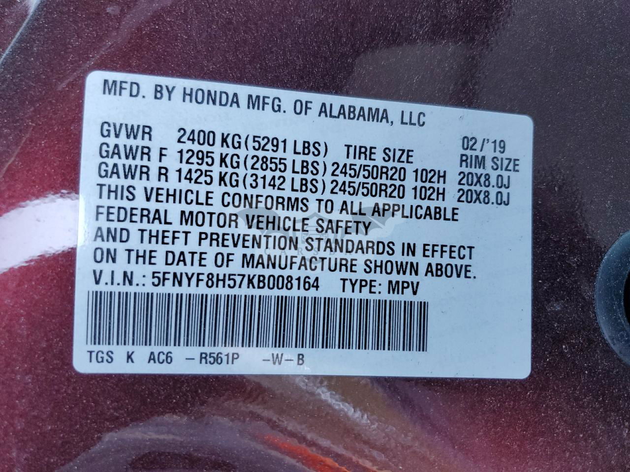 • VIN: 5FNYF8H57KB008164
