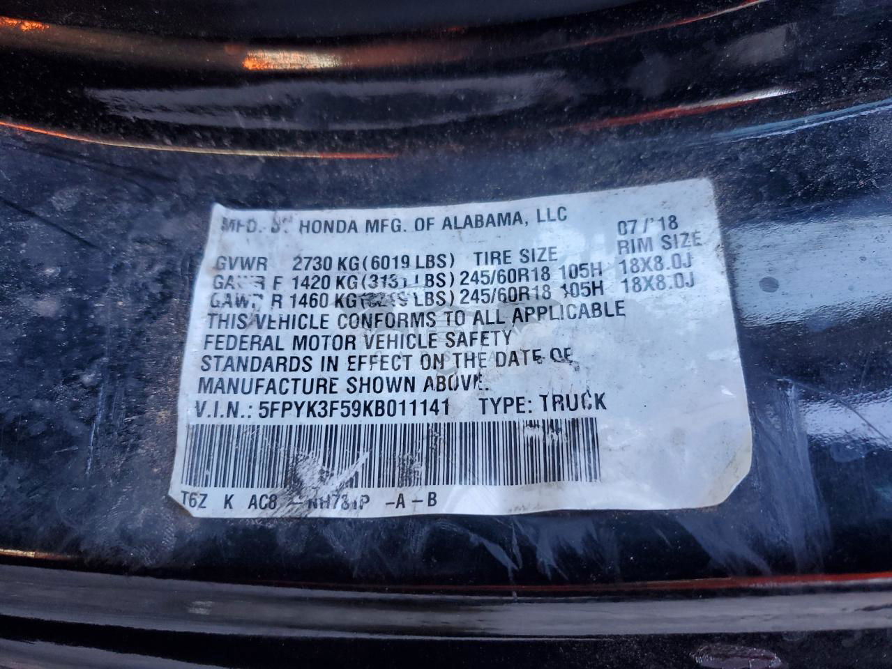 • VIN: 5FPYK3F59KB011141