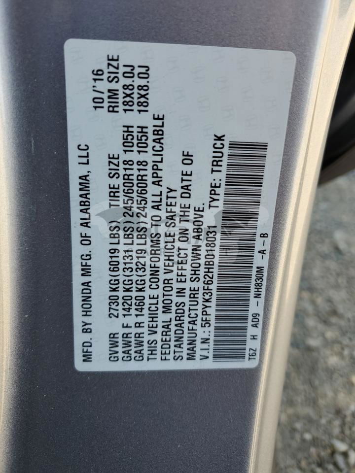 • VIN: 5FPYK3F62HB018031