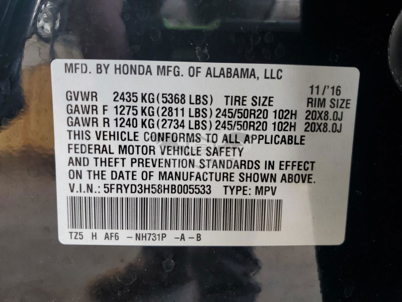 • VIN: 5FRYD3H58HB005533