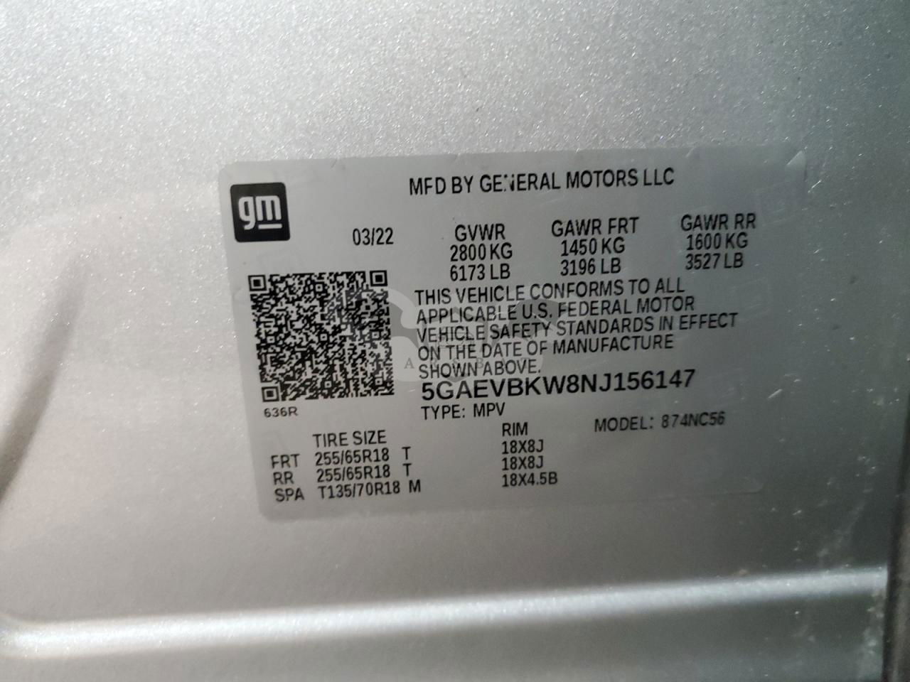 • VIN: 5GAEVBKW8NJ156147