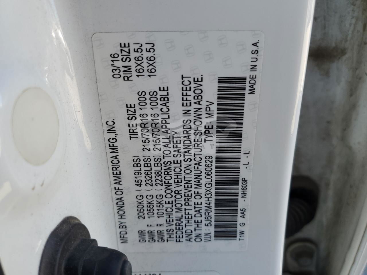 • VIN: 5J6RM4H3XGL060629