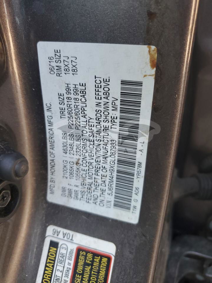 • VIN: 5J6RM4H9XGL087933