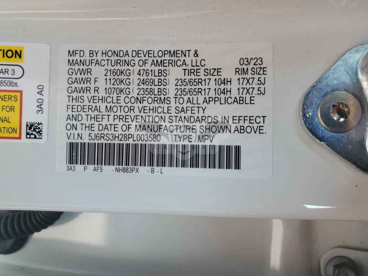 • VIN: 5J6RS3H28PL003580