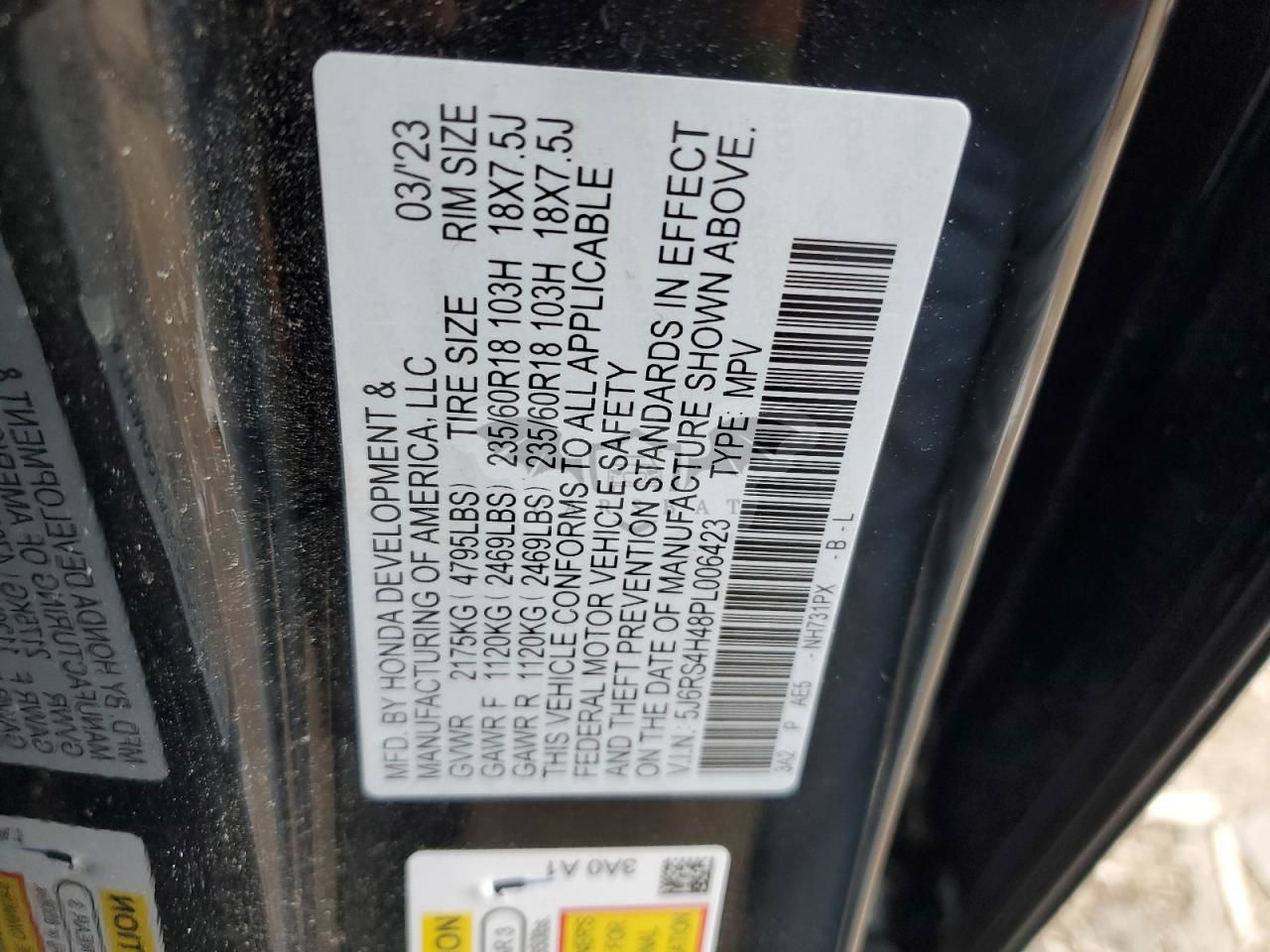 • VIN: 5J6RS4H48PL006423