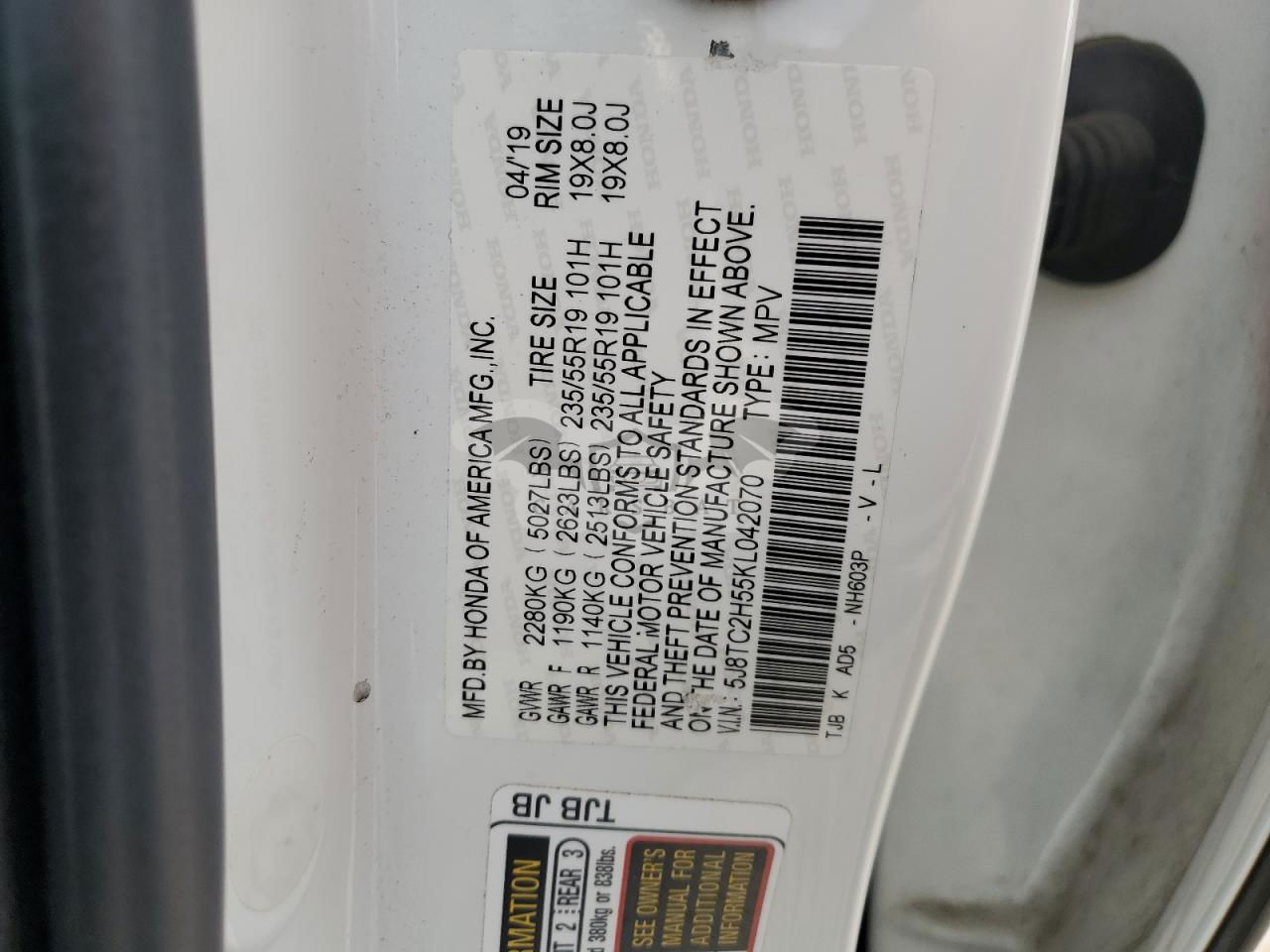• VIN: 5J8TC2H55KL042070