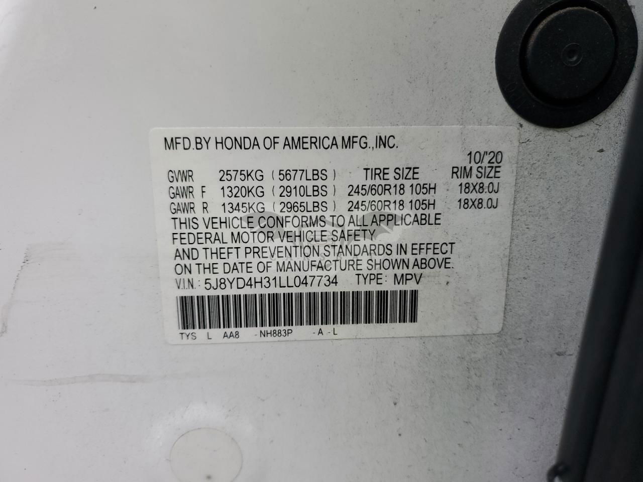 • VIN: 5J8YD4H31LL047734