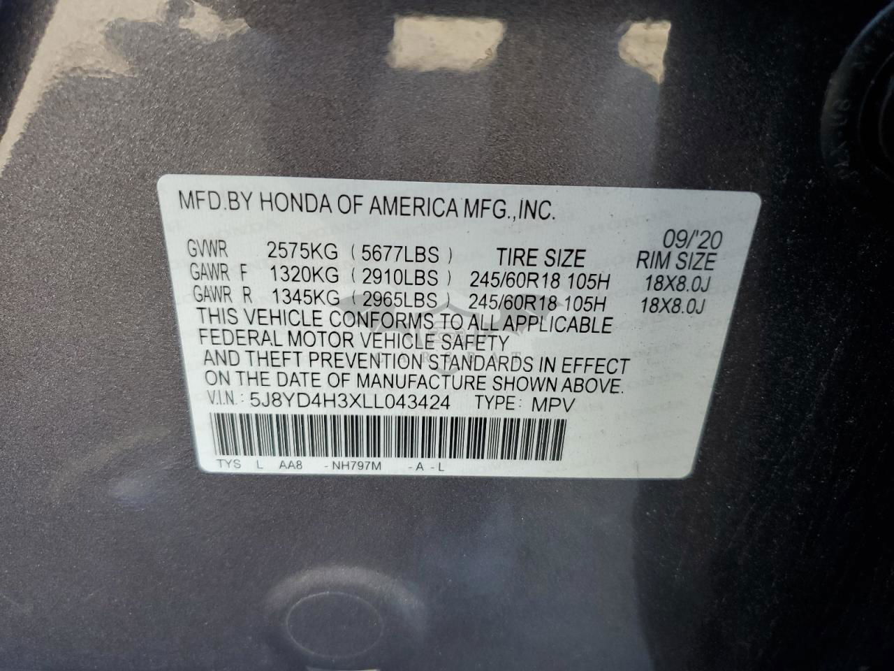 • VIN: 5J8YD4H3XLL043424