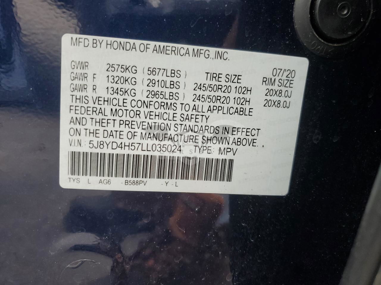 • VIN: 5J8YD4H57LL035024