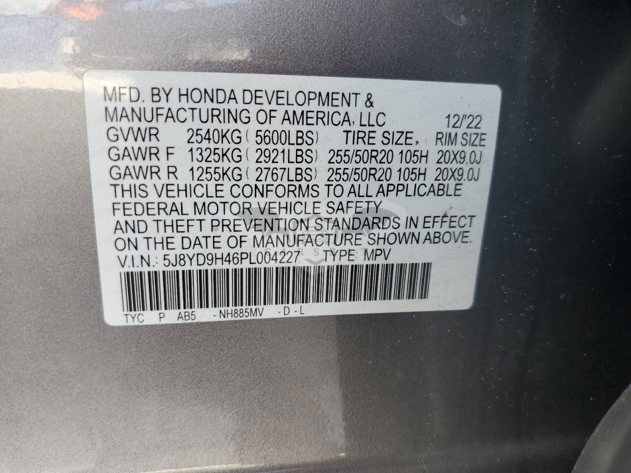 • VIN: 5J8YD9H46PL004227