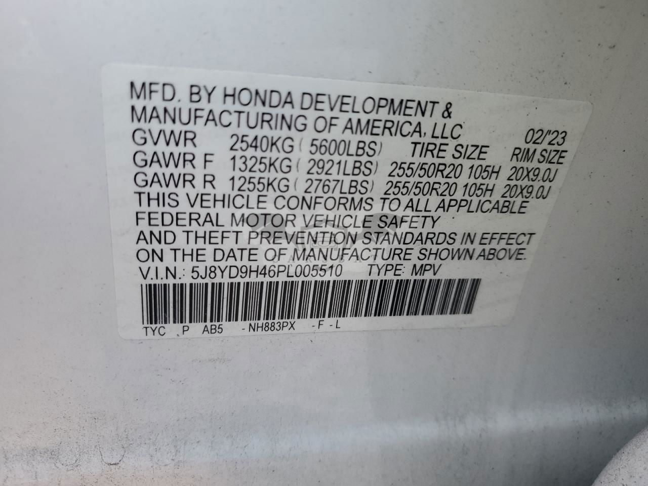 • VIN: 5J8YD9H46PL005510