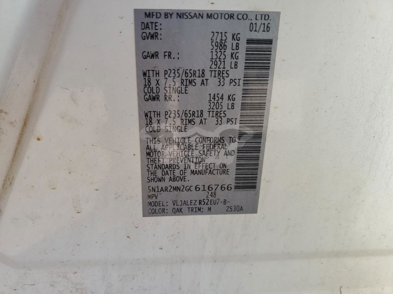 • VIN: 5N1AR2MN2GC616766