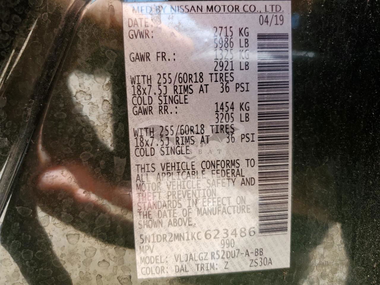 • VIN: 5N1DR2MN1KC623486