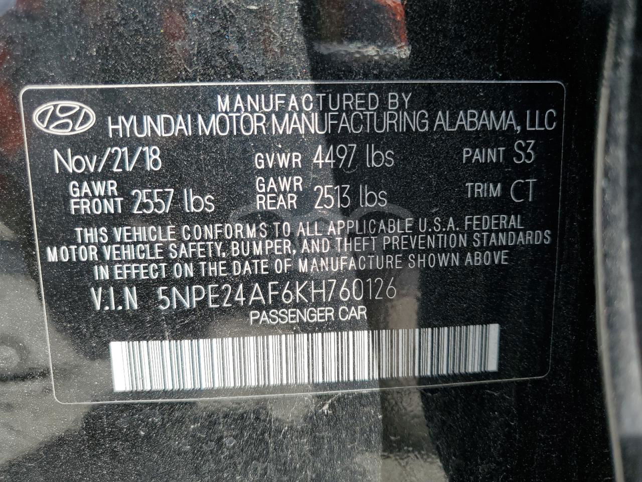• VIN: 5NPE24AF6KH760126