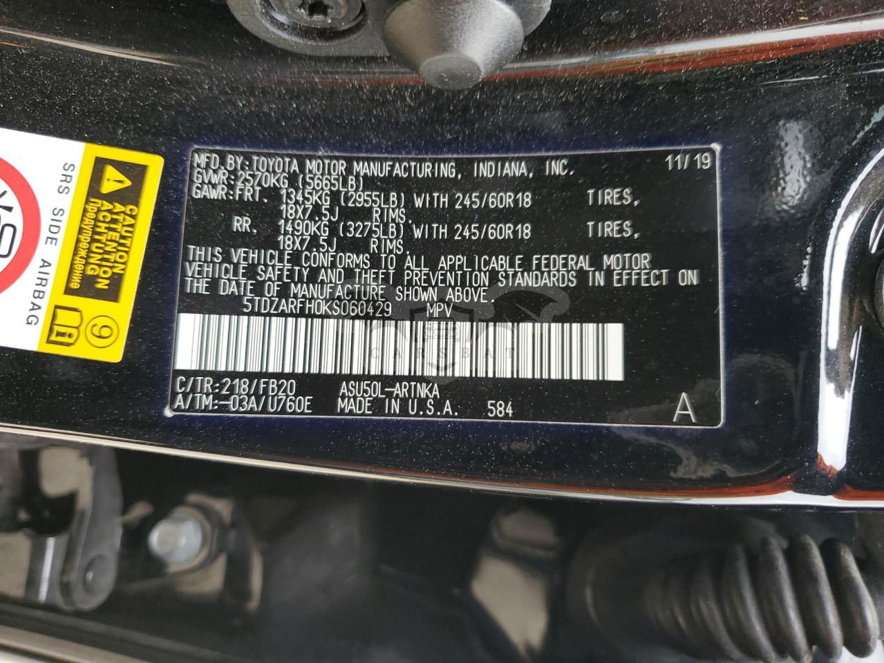 • VIN: 5TDZARFH0KS060429