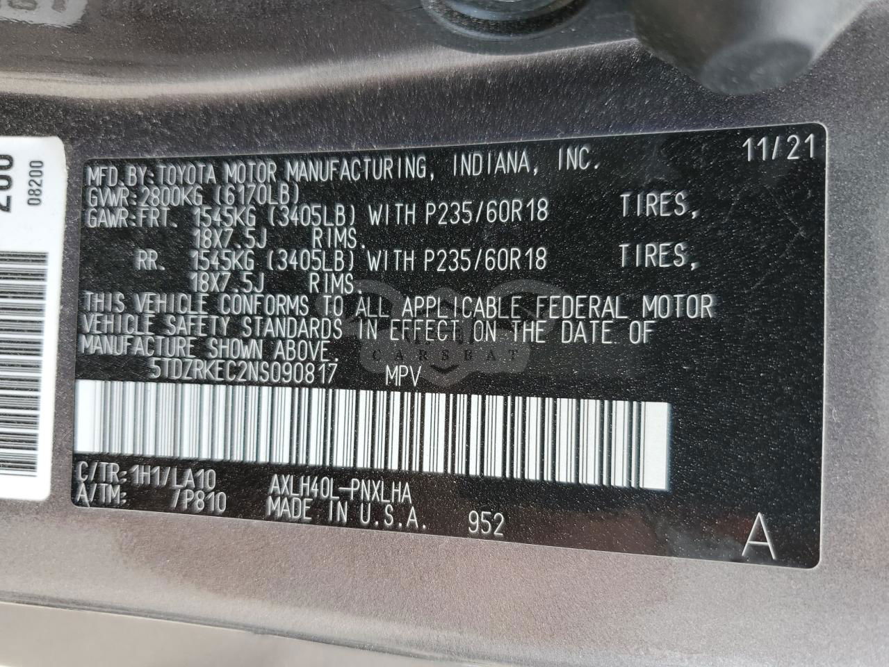 • VIN: 5TDZRKEC2NS090817