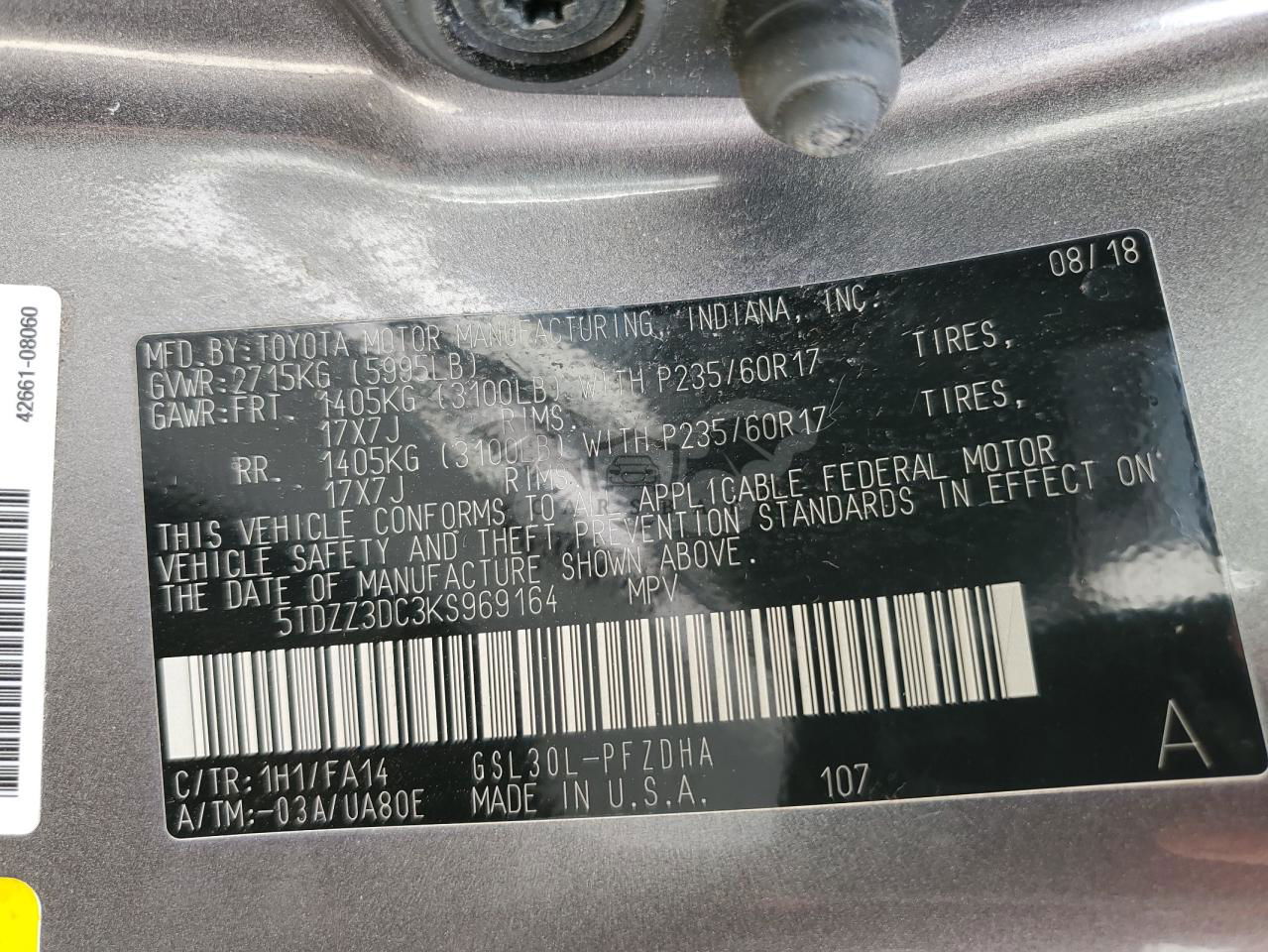 • VIN: 5TDZZ3DC3KS969164