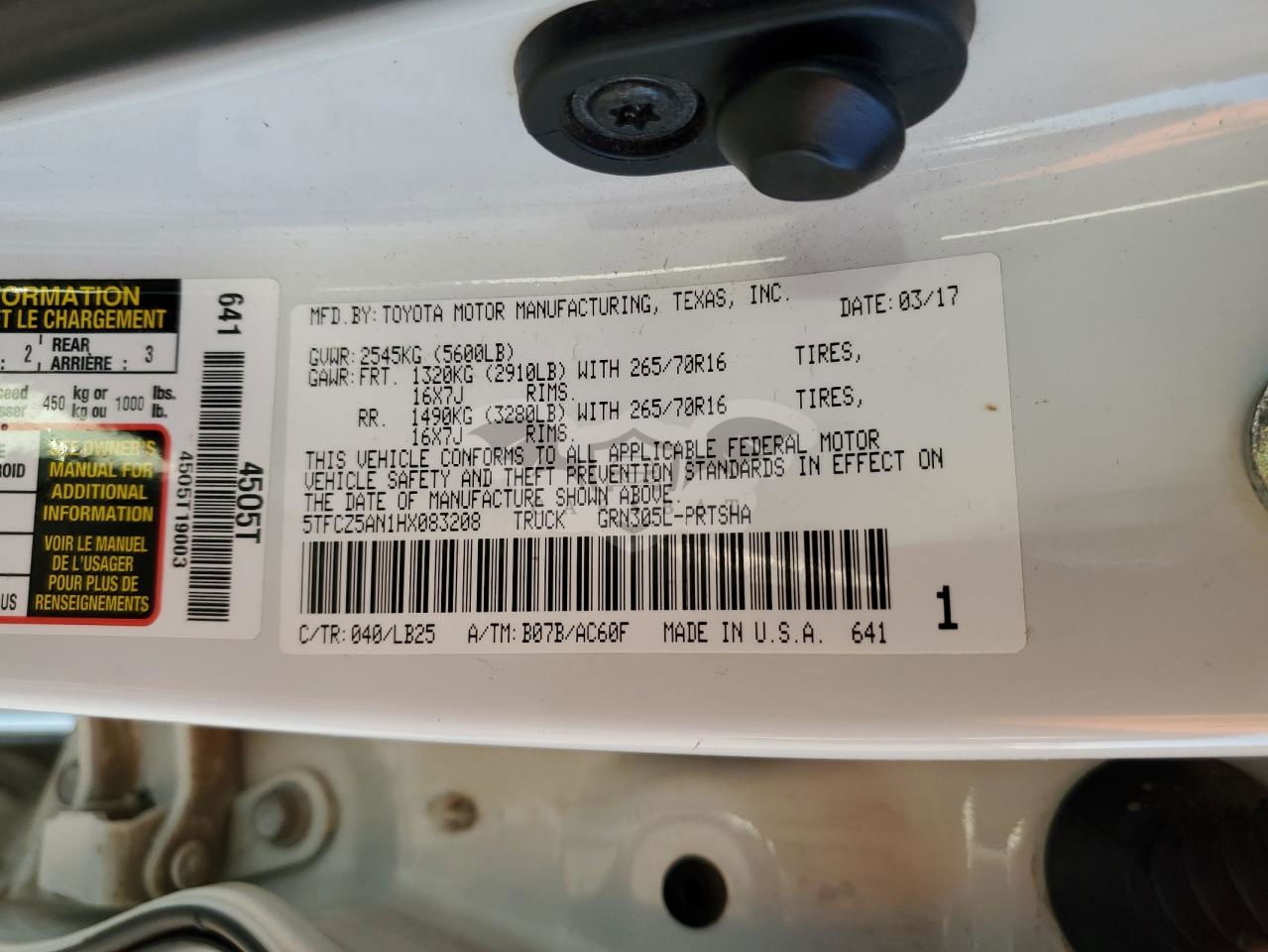 • VIN: 5TFCZ5AN1HX083208