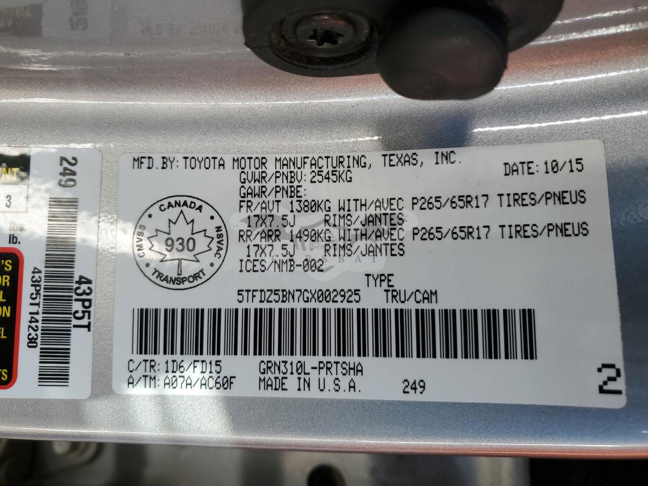 • VIN: 5TFDZ5BN7GX002925