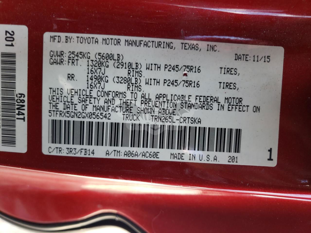 • VIN: 5TFRX5GN2GX056542