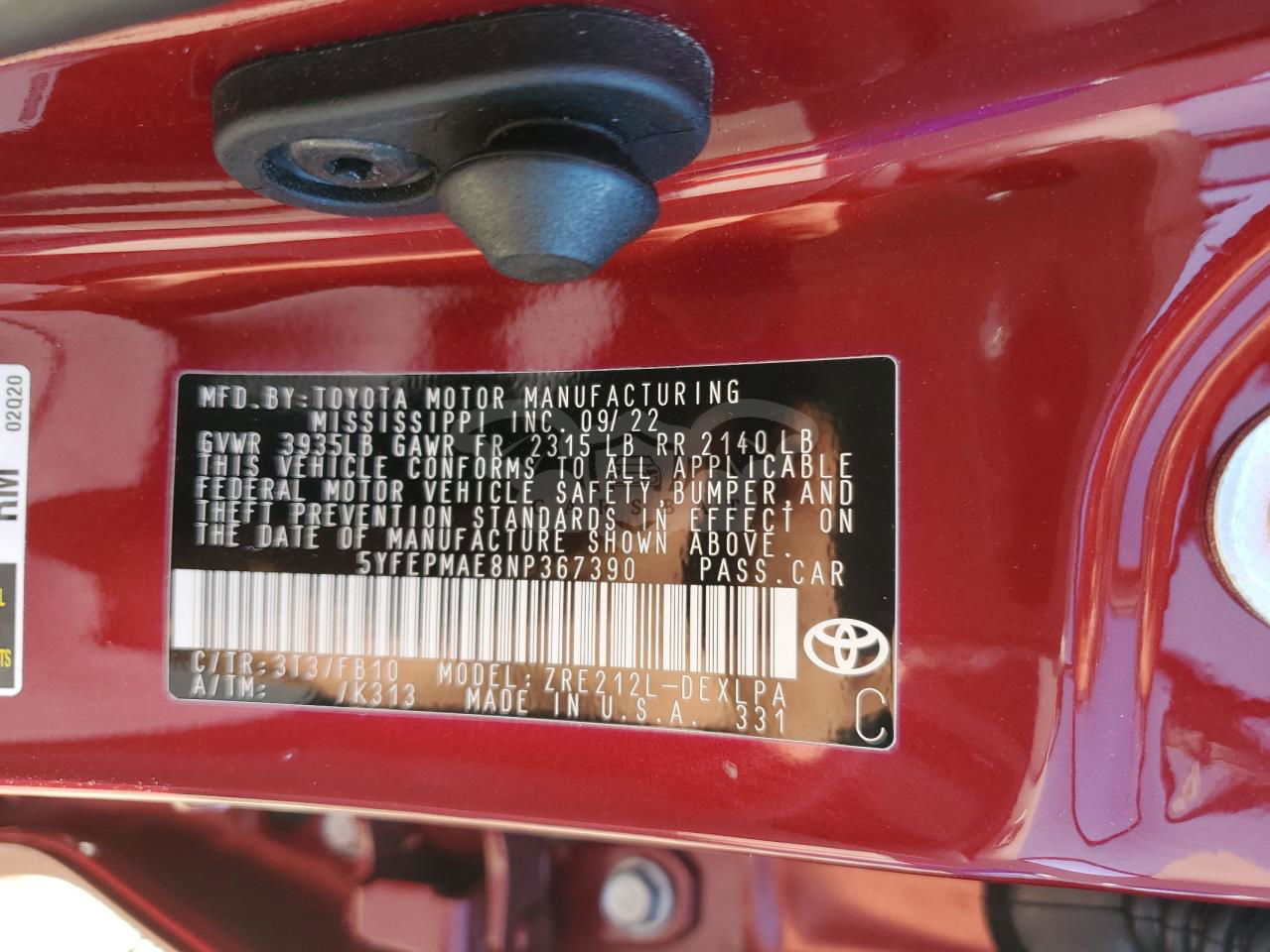 • VIN: 5YFEPMAE8NP367390