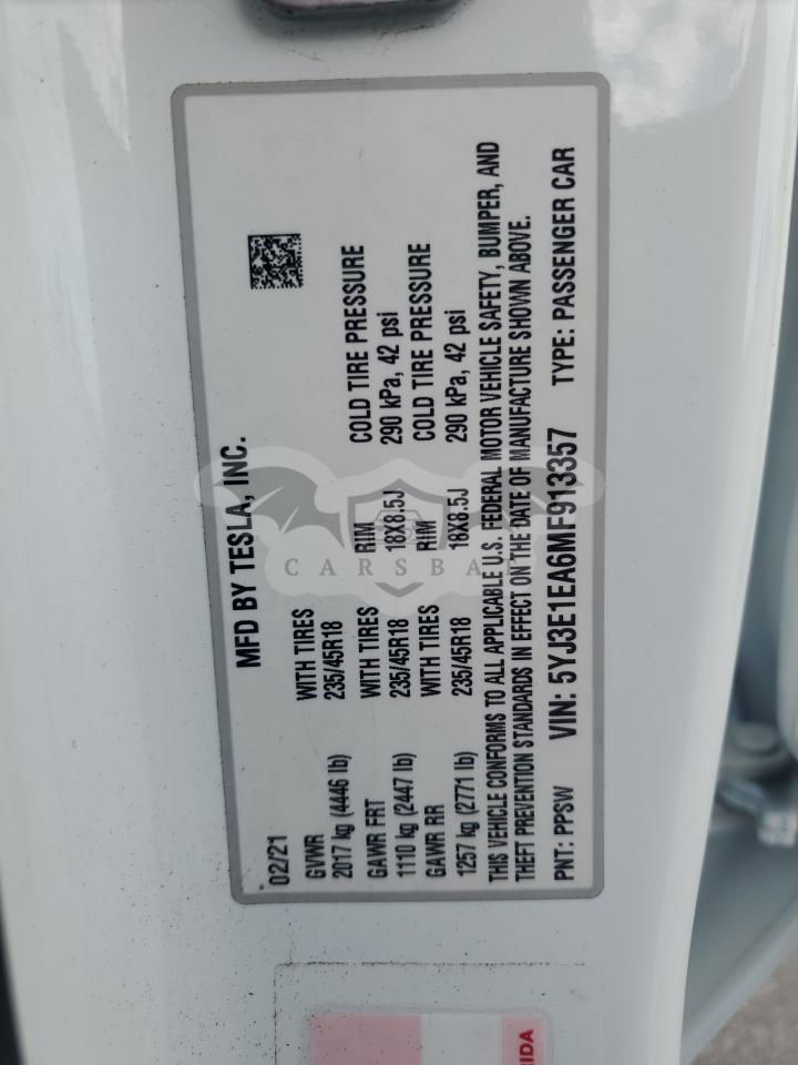• VIN: 5YJ3E1EA6MF913357