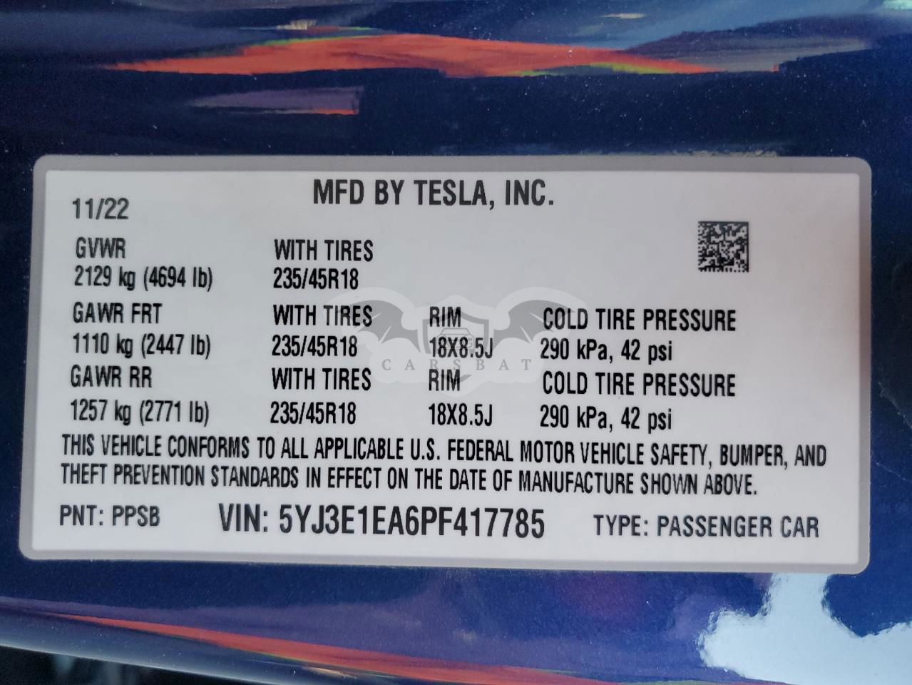 • VIN: 5YJ3E1EA6PF417785