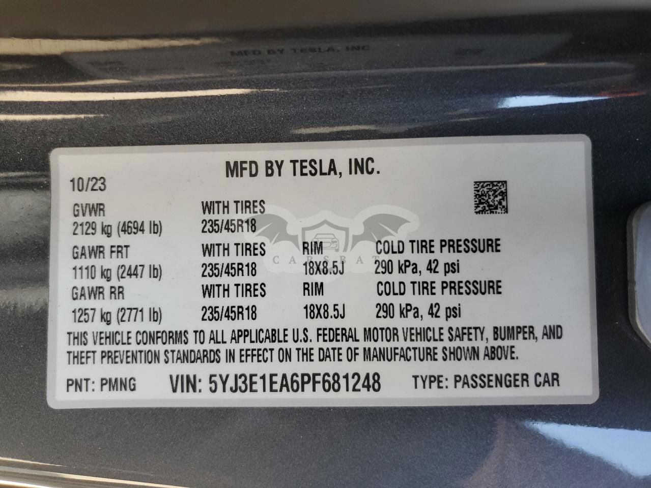 • VIN: 5YJ3E1EA6PF681248