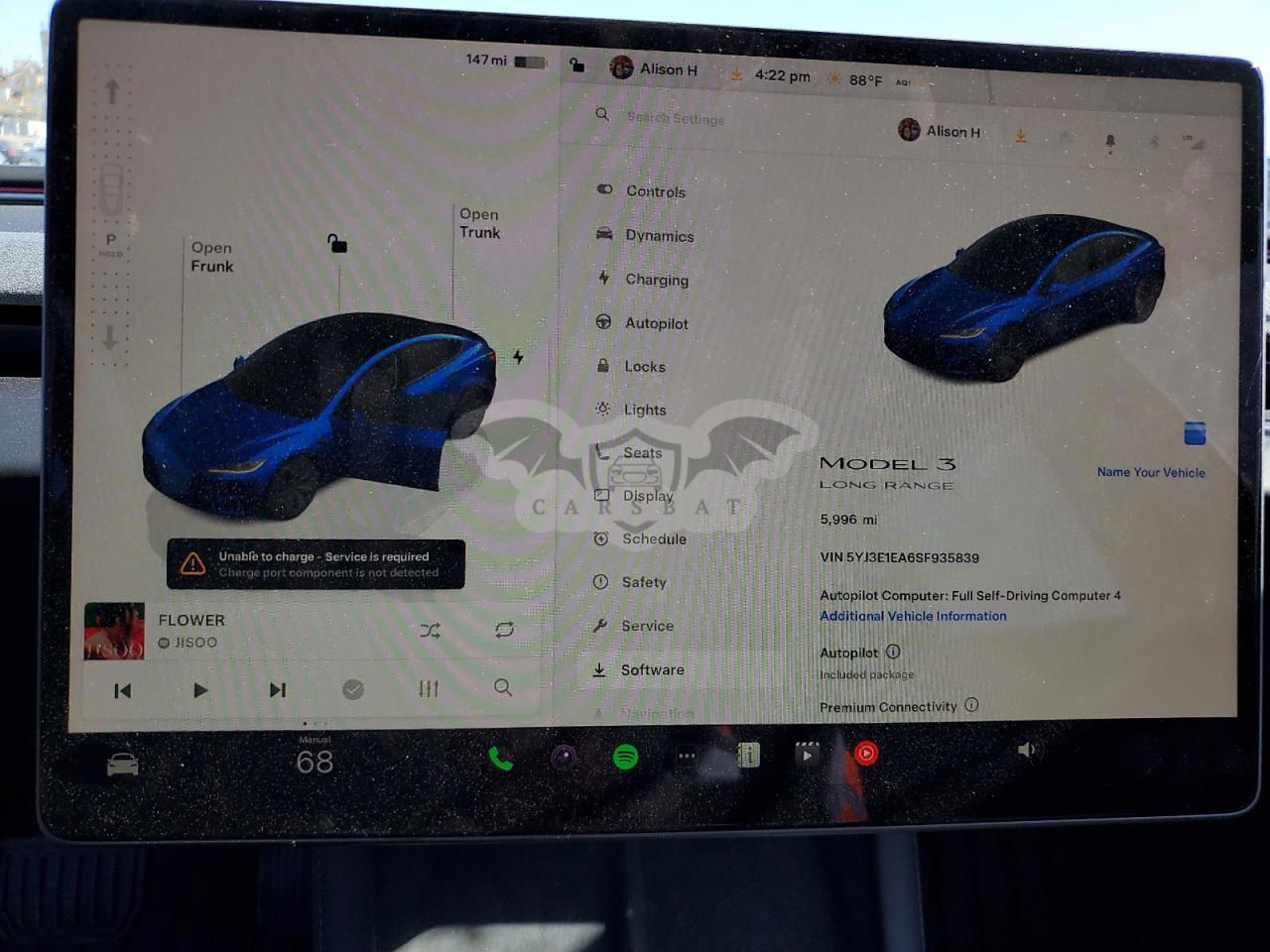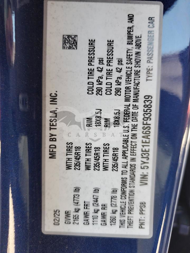 • VIN: 5YJ3E1EA6SF935839