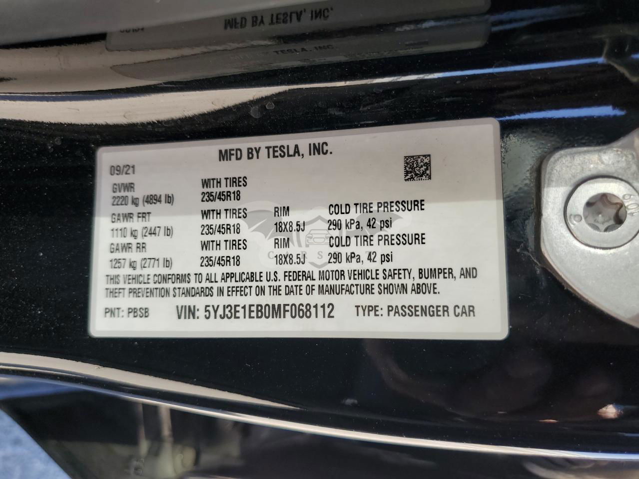 • VIN: 5YJ3E1EB0MF068112