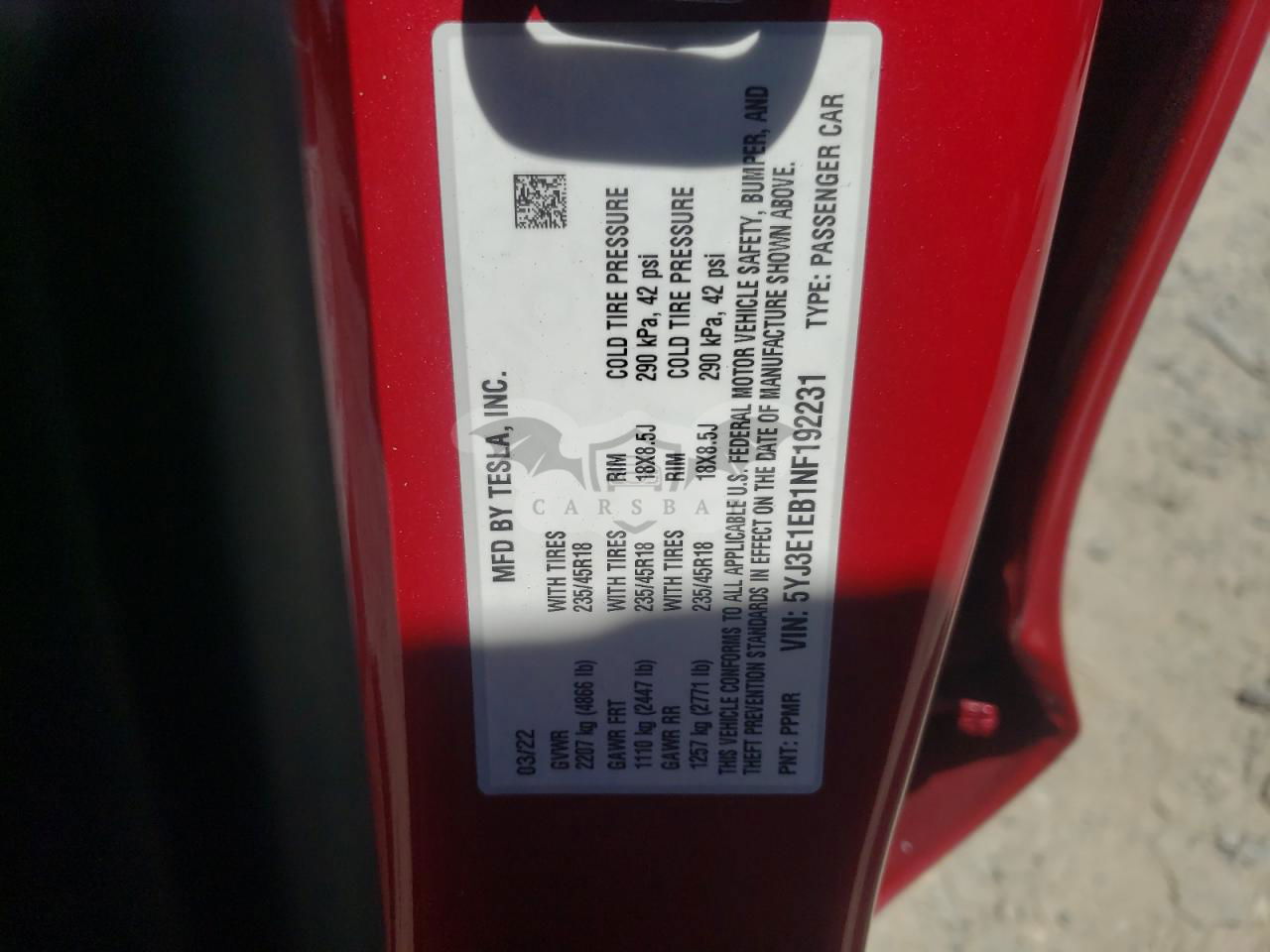 • VIN: 5YJ3E1EB1NF192231