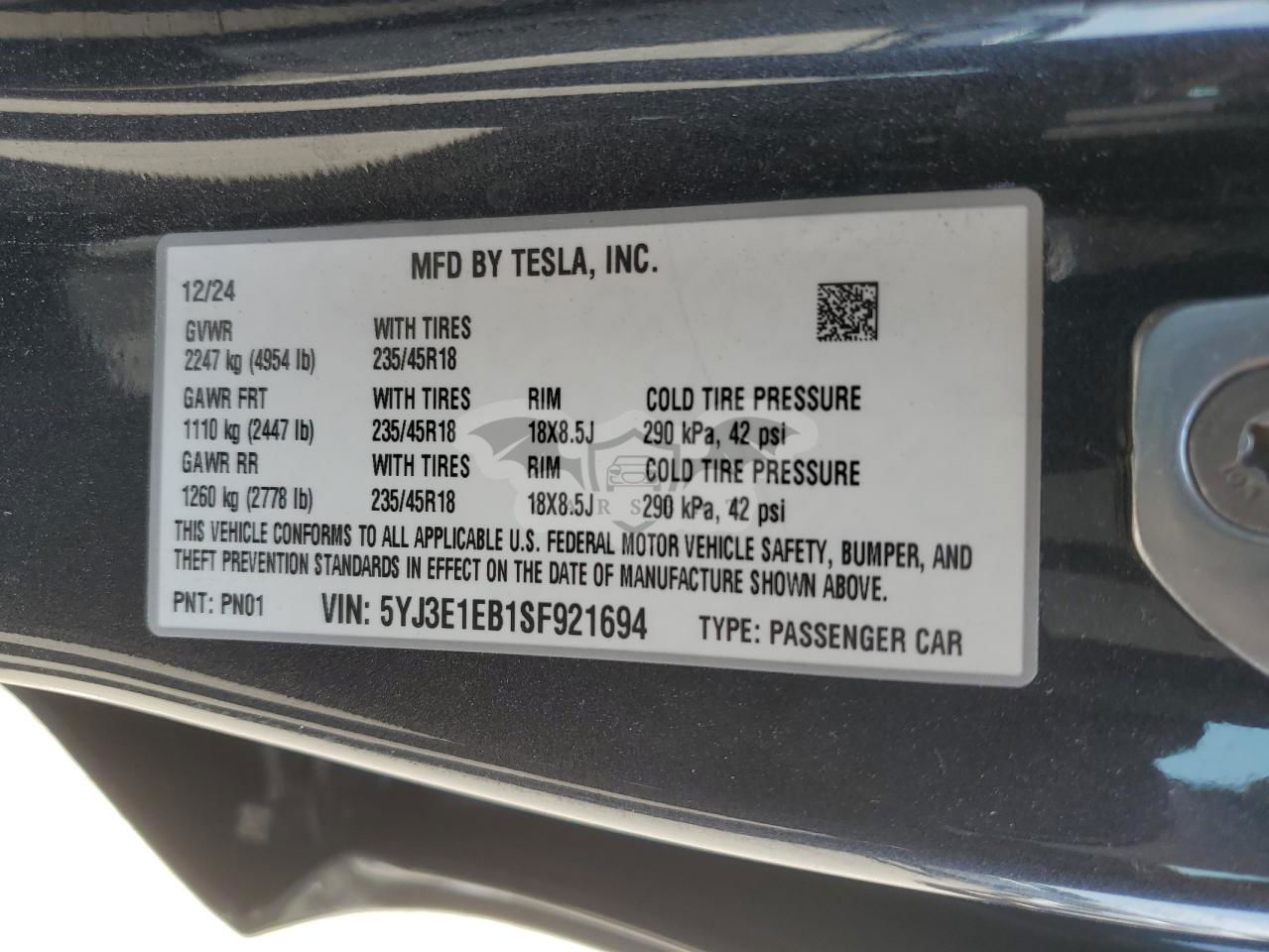 • VIN: 5YJ3E1EB1SF921694