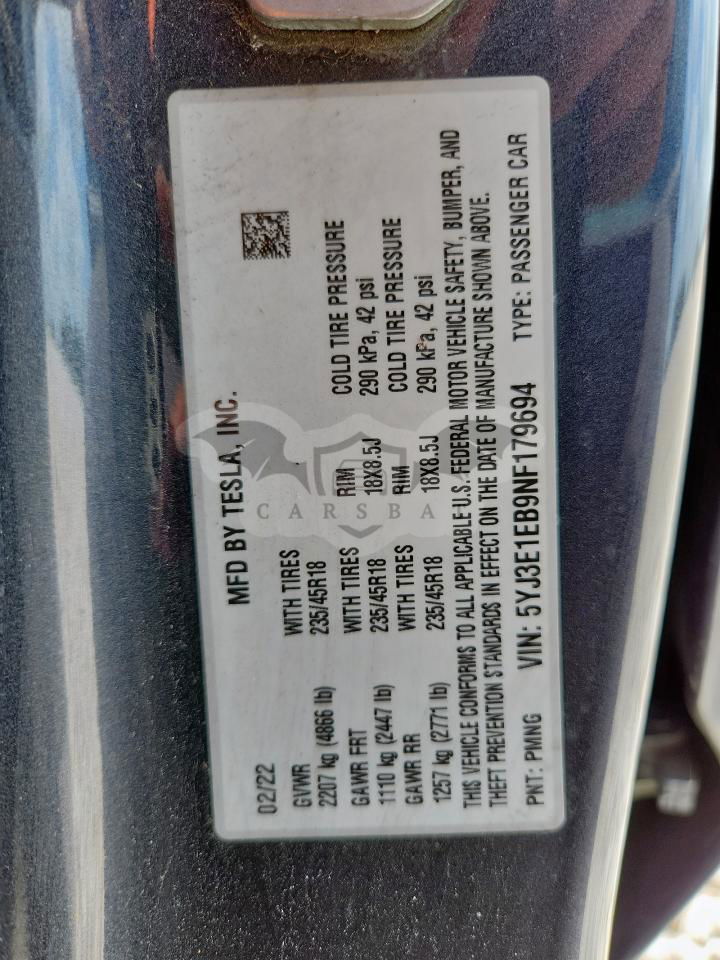 • VIN: 5YJ3E1EB9NF179694