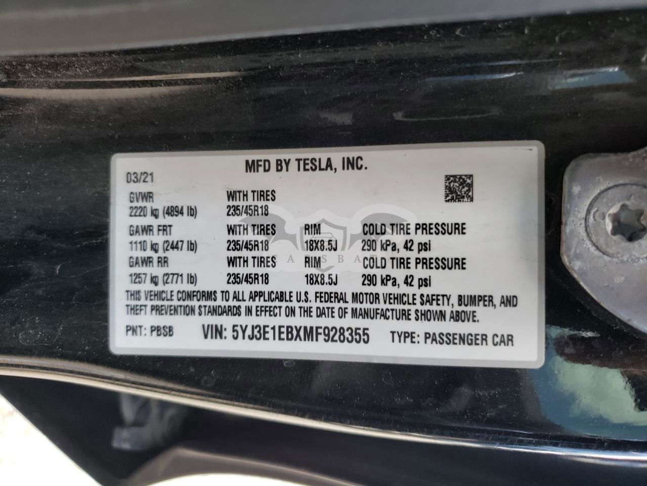 • VIN: 5YJ3E1EBXMF928355