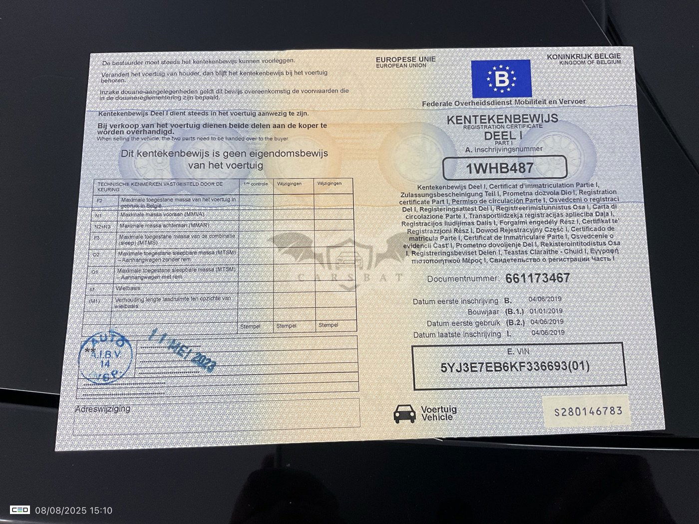 • VIN: 5YJ3E7EB6KF336693