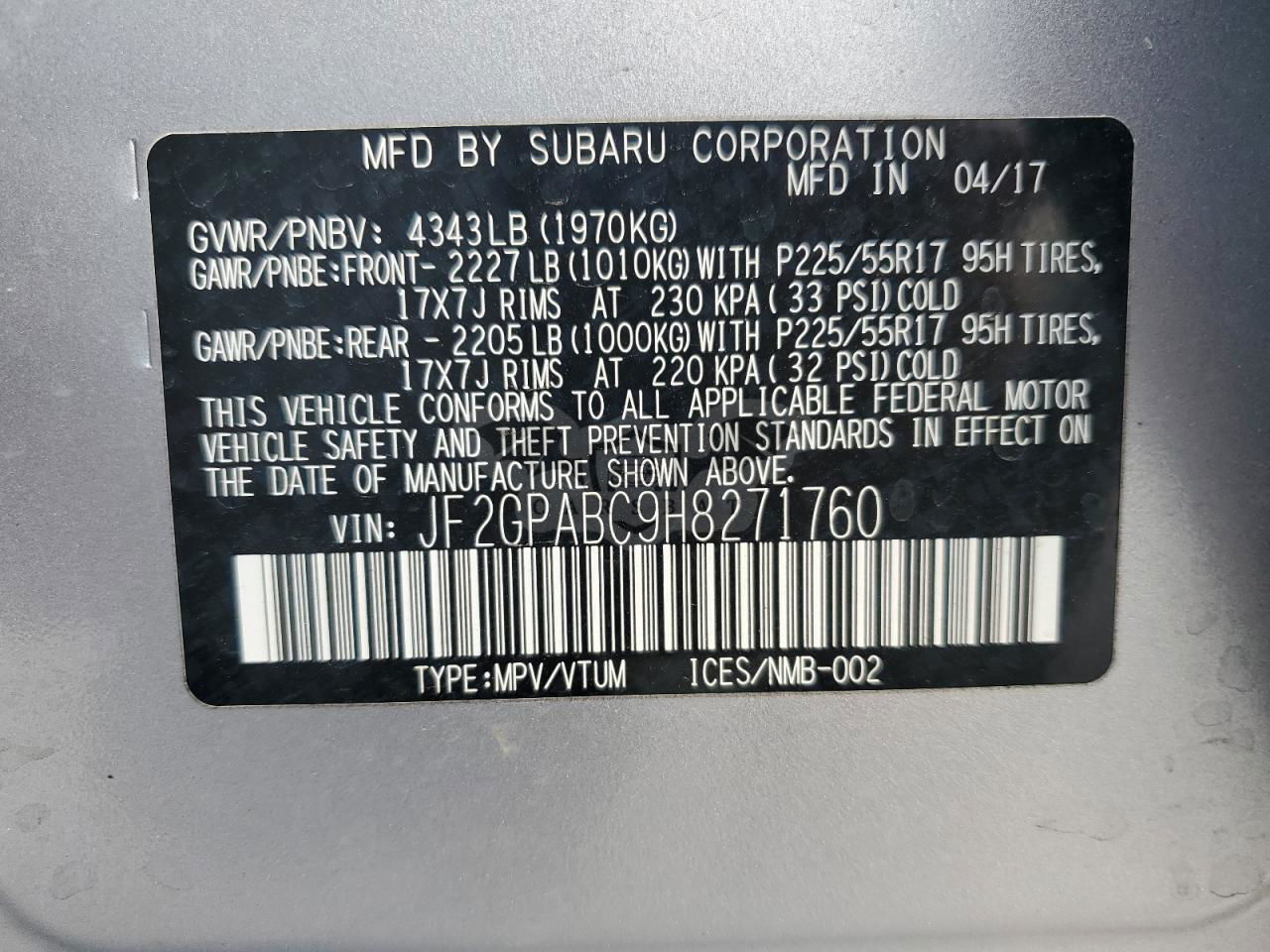• VIN: JF2GPABC9H8271760
