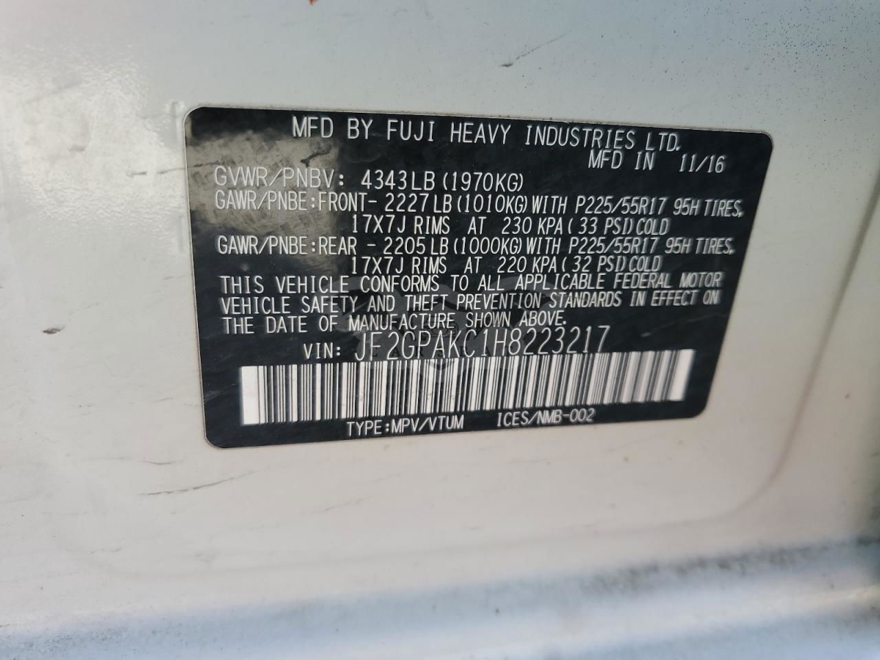 • VIN: JF2GPAKC1H8223217