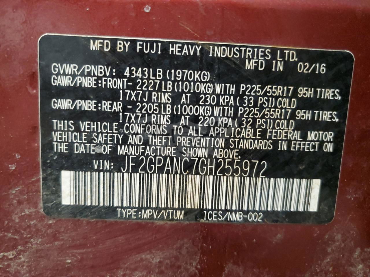 • VIN: JF2GPANC7GH255972