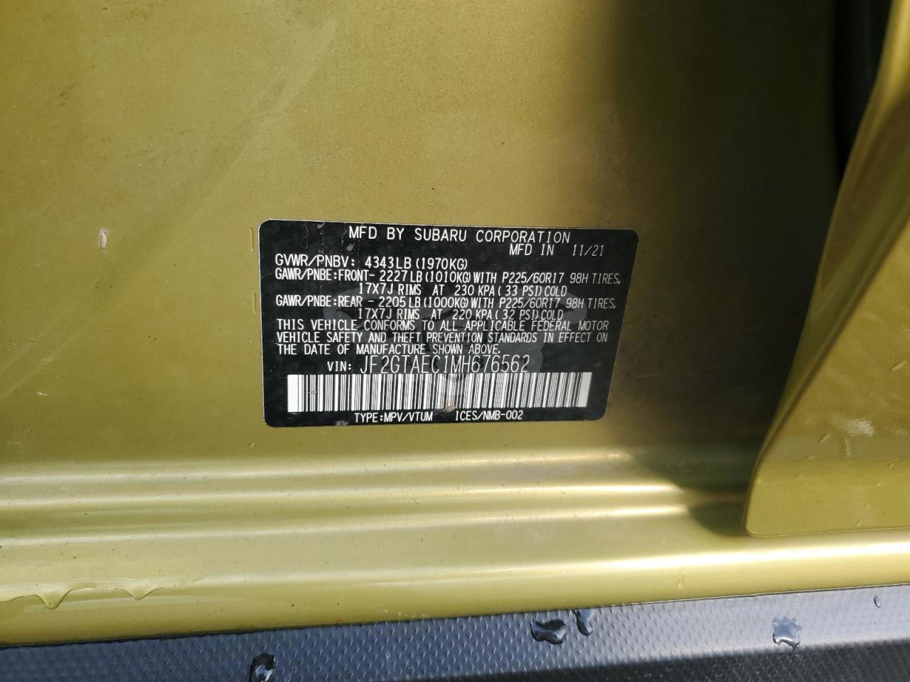 • VIN: JF2GTAEC1MH676562
