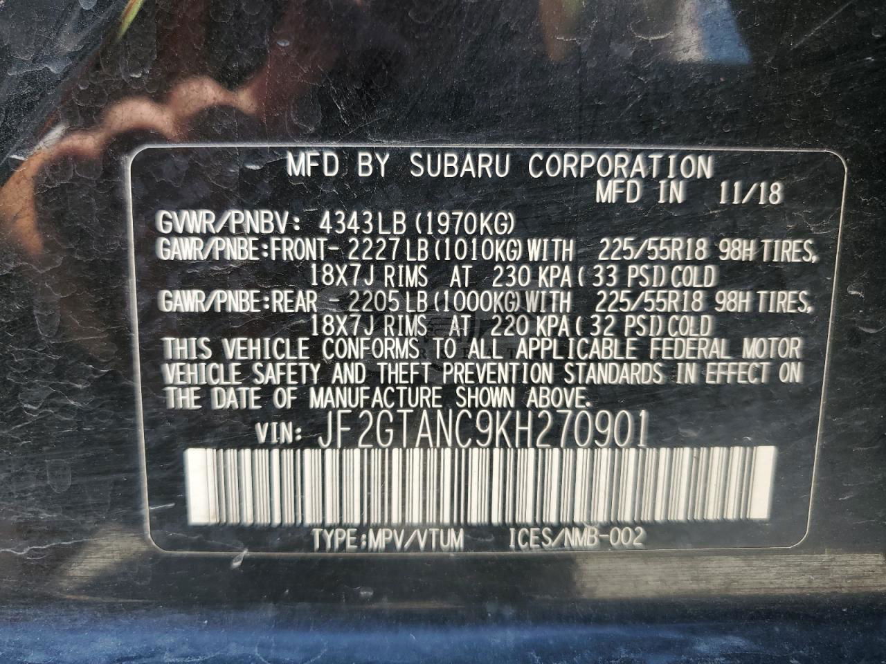 • VIN: JF2GTANC9KH270901