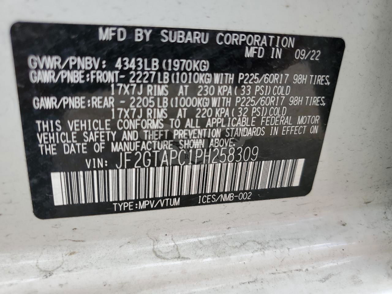• VIN: JF2GTAPC1PH258309