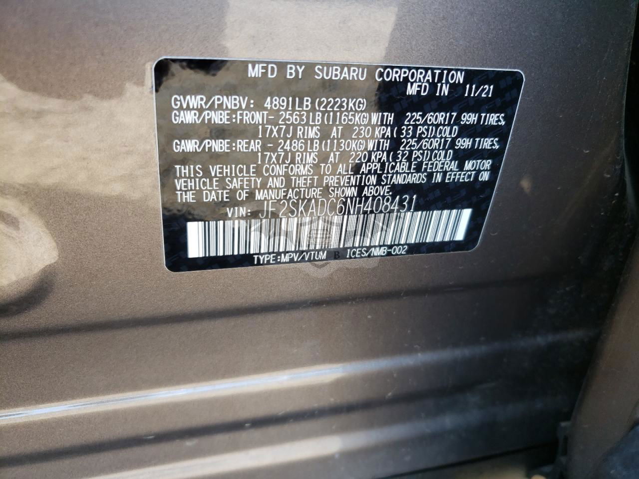 • VIN: JF2SKADC6NH408431