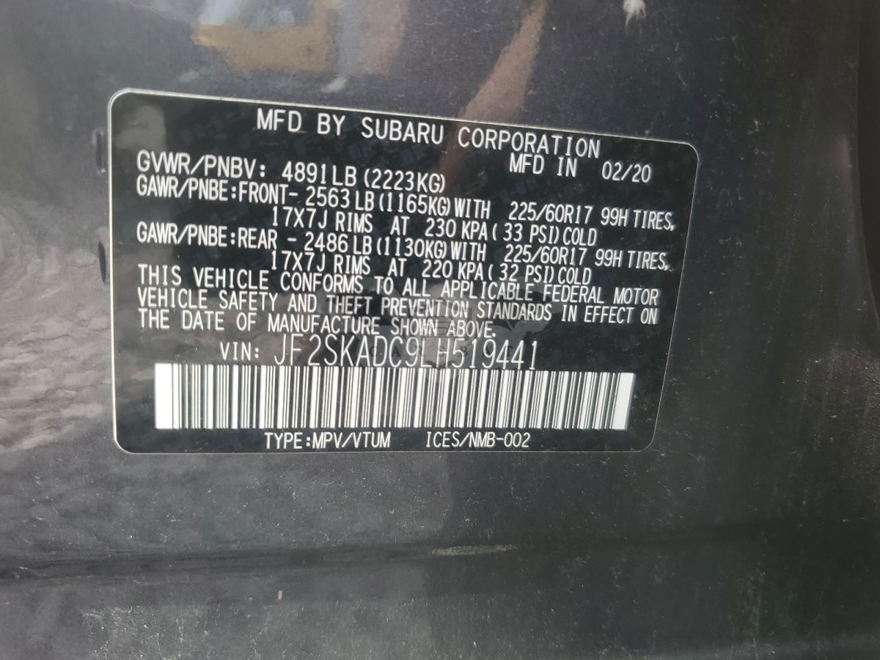 • VIN: JF2SKADC9LH519441