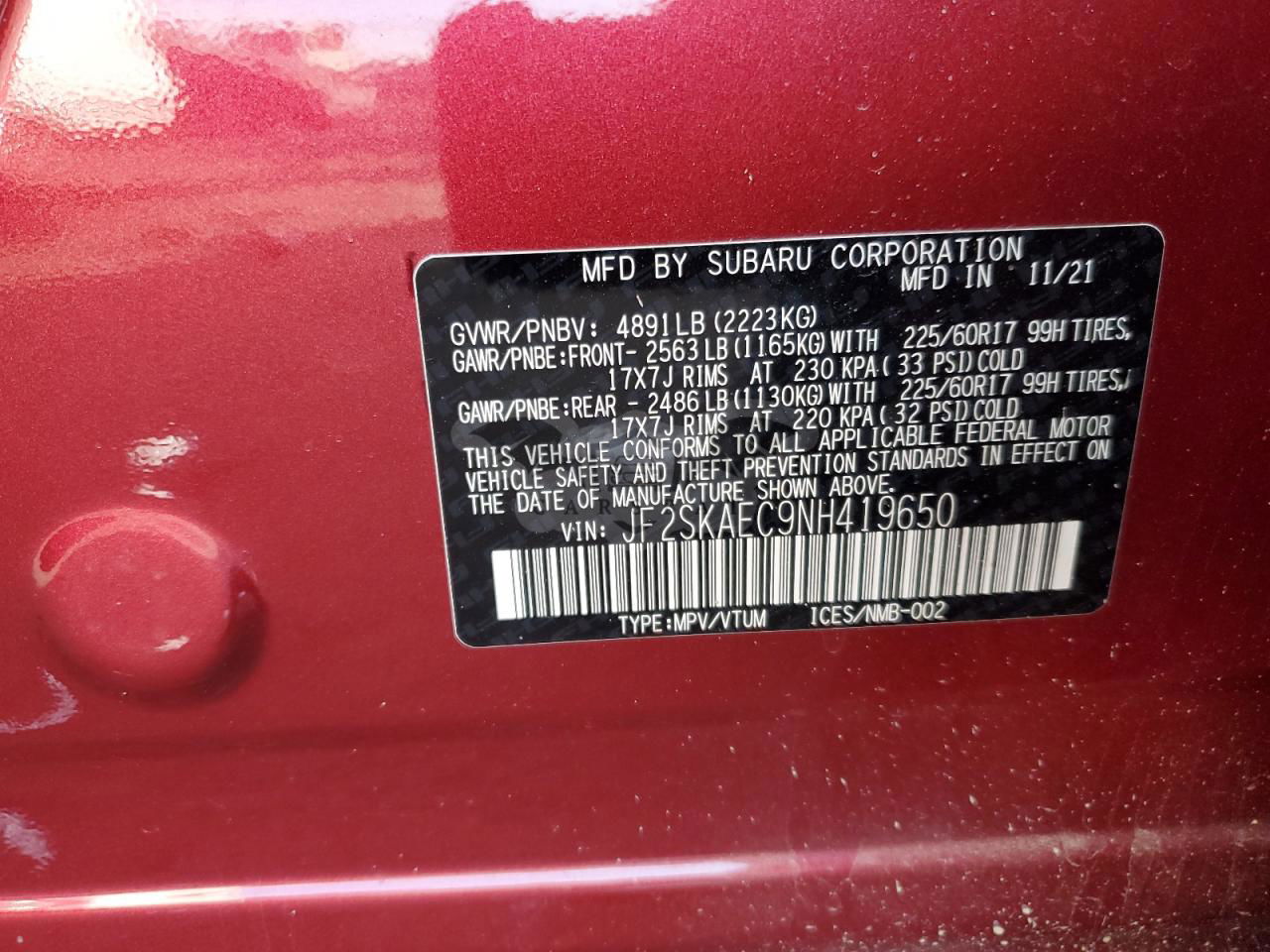 • VIN: JF2SKAEC9NH419650