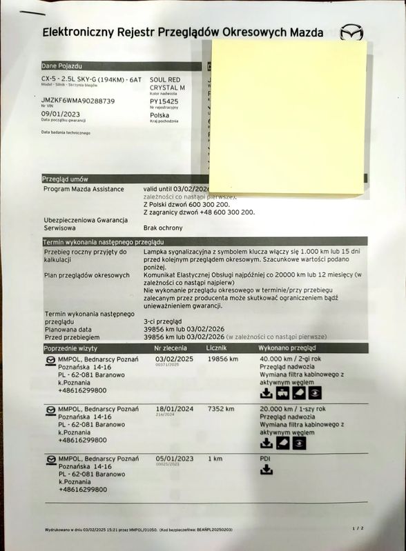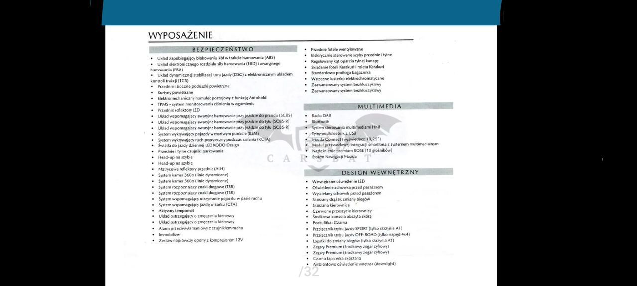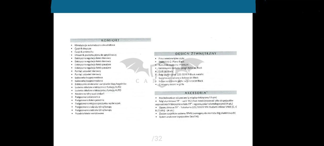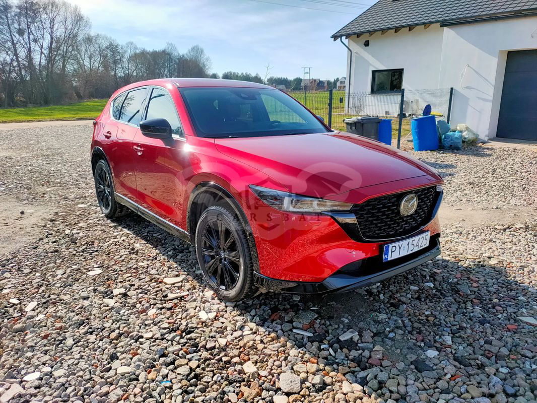 Cesja leasingu Mazdy CX-5 2.5L HOMURA 2WD. Auto kupione w Mazda Bednarscy w Baranowie koło Poznania. Bardzo mały przebieg 20516 km można powiedzieć że wygląda jak nowa, jest w 100% sprawna, nie było żadnych napraw ani żadnych przygód, lakier oryginalny. Samochód zadbany, pierwsza wymiana oleju wykonana już po 7.352 km. Drugi przegląd przy 19856 km czyli jest świeżo po serwisie oleju i filtrów. Warunki leasingu: Auto jest obecnie w leasingu w Santander Consumer Multirent (SCM) Rodzaj leasingu: operacyjny Odstępne: 30000,00 PLN ( nie jestem płatnikiem vat ) Liczba pozostałych rat: 33 (licząc od kwietnia 2025) Kwota raty: 2305,99 PLN brutto ( faktura płatna do 28 każdego miesiąca) Wykup końcowy: 50640,00 PLN brutto Mazda jest na gwarancji . Objęta jest pakietem assistance na terenie Polski oraz Europy . Darmowa aplikacja My Mazda z której można sterować samochodem oraz sprawdzić gdzie się w danej chwili znajduje . Mazda w wersji poliftowej. Wyposażenie niemal maksymalne a w jego skład wchodzi: -lampy led skrętne, adaptacyjne (automatyczne światła drogowe , wycinanie) -tempomat aktywny -asystent utrzymania pasa ruchu -radar przedni ostrzegający o możliwej kolizji a w razie potrzeby sam reaguje -czujniki martwego pola -system rozpoznawanie znaków drogowych -Nawigacja z wgranymi najnowszymi mapami -head up - Wyświetlacz kolorowy który wyświetla na szybie najważniejsze informacje (prędkość, ograniczenie prędkości, dane z nawigacji, dane z tempomatu, dane z czujników martwego pola oraz z przedniego radaru) -szyberdach elektrycznie otwierany oraz uchylany -czarna podsufitka -nagłośnienie Bose 10 głośników a w tym subwoofer -Klimatyzacja automatyczna dwustrefowa -Podgrzewane fotele przednie -wentylowane fotele przednie -podgrzewana kanapa tył -podgrzewana kierownica -Gniazda USB w podłokietniku przednim oraz tylnym -ładowarka indukcyjna -Elektryczne fotele przednie z pamięcią położenia -Elektrycznie ustawiane, składane oraz podgrzewane lusterka -Lusterko wsteczne fotochromatyczne - System homelink- możliwość zaprogramowania bramy garażowej lub bramy wjazdowej (do 3 szt) -Skórzana tapicerka przeszyta czerwoną nicią -Automatycznie otwierana klapa bagażnika z roletą -Kamera cofania -Wyświetlacz główny cyfrowy - System monitorujący ciśnienie w oponach -Duży wyświetlacz multimedialny -System apple car play oraz android auto -Zestaw głośnomówiący -Piękne 19 calowe felgi -dojazdowe koło zapasowe -hak -przyciemniane szyby -2 kluczyki - System alarmowy
