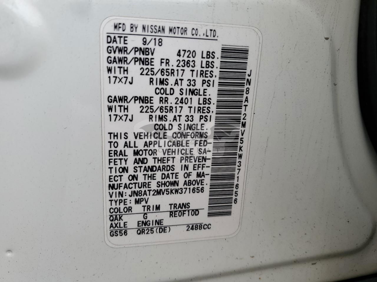 • VIN: JN8AT2MV5KW371656